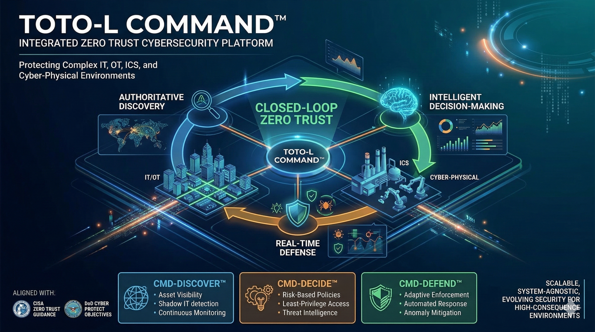 TOTO-L COMMAND™ operationalizes Zero Trust by closing the loop between authoritative discovery, intelligent decision-making, and real-time defense, enabling continuous verification, least-privilege access, and adaptive enforcement aligned with CISA Zero Trust guidance and DoD Cyber Protect objectives. The platform is composed of: CMD-DISCOVER™ , CMD-DECIDE™ , and CMD-DEFEND™ .